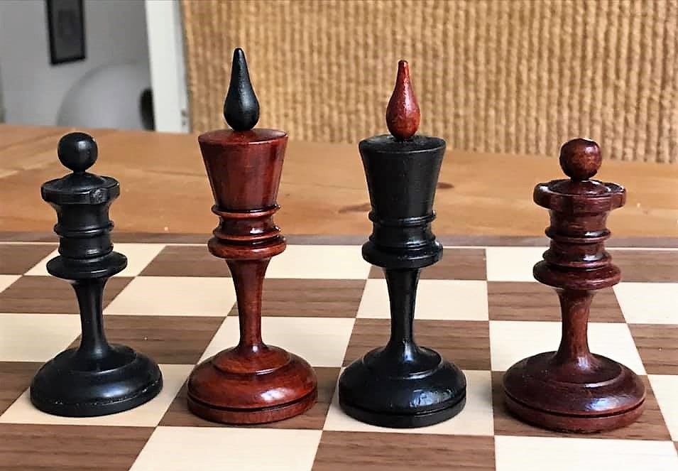 The King and Queen are inspired by those of the Smyslov set of the 1920s and 1930s, as are the pawns. Perhaps the most striking feature of the Smyslov design is the dendriform structure of the stems, an Modernist architectural feature found in Frank Lloyd Wright’s dendriformic columns in the S.C. Johnson office building in Racine, Wisconsin USA and in Moscow’s Stalin Award-winning Kropotkinskaya Metro Station.