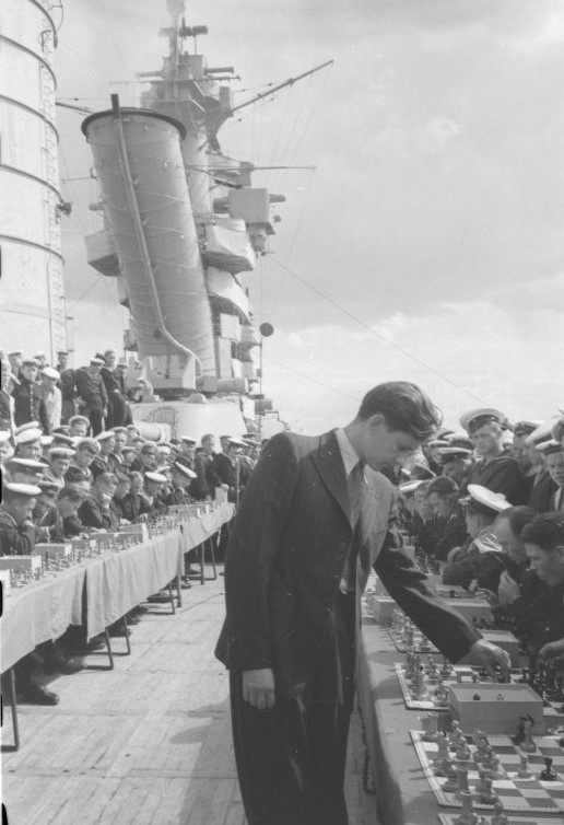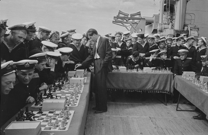 Shortly after the Second World War, Tal sets were used in a simultaneous exhibition that Estonian great Paul Keres played with players from the crew of the Soviet battleship October Revolution when it docked in Tallinn in 1946. The pieces in the following two photos seem to have evolved. The bases appear thicker, the pawns stubbier, and the rook stems thicker and straighter.