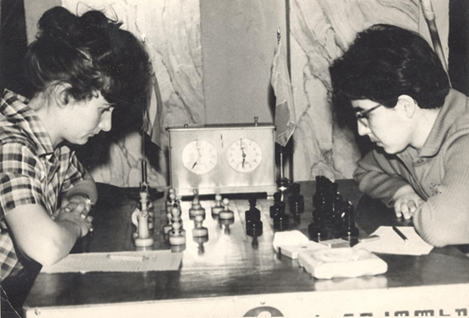 By the late fifties, use of these pieces migrated to Georgia SSR, where they became very popular, and used in major tournaments there and nearby Yerevan for decades. It was in Georgia that they likely evolved into the form seen on the cover of Tal’s biography, complete with the taller bases and stout pawns with very short stems. The next three photos show the Tal pieces in use in Georgia from 1959 to 1979.
