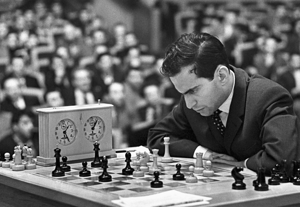 The next photo shows in great detail the Tal set used in the 1959 USSR Championship held in Tbilisi, Georgia SSR. The pieces have reached their mature form, with stout bases, extraordinarily squat pawns, and chunkier, less tubular knights than in the original Tallinn version of the set. The photo depicts the pieces at use in Tigran Petrosian’s game against Yuri Averbakh, a Najdorf Sicilian Defense won by Petrosian, who won the game and the championship.