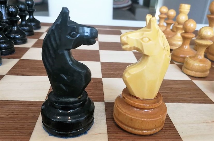 Here is a set from the seventies. It is slathered in uneven, taffy apple varnish. The knights are all wooden but the wooden finials have been replaced with plastic ones.