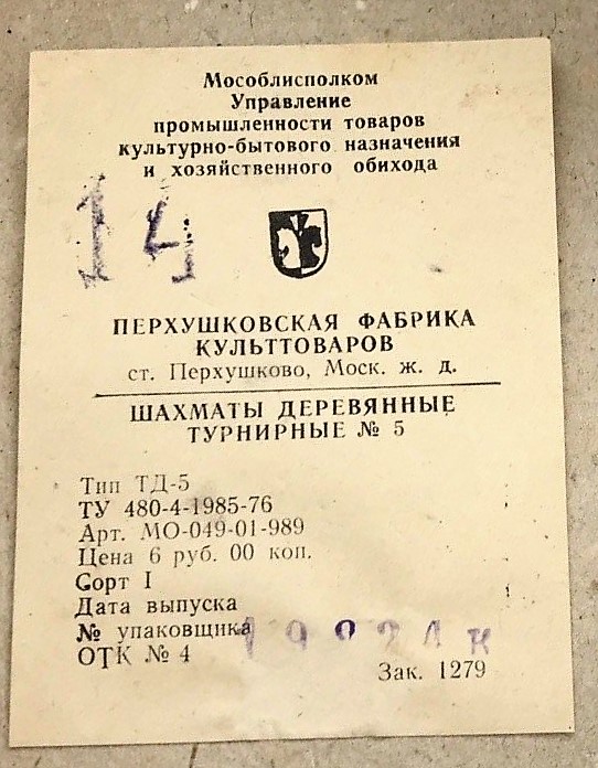 By 1967, the GM2 sets, manufactured in the Perkhushkovaya Factory of Cultural Goods in Moscow, began to sport plastic finials. Here is a set made in 1967 from the collection of Eduardo Bauza, together with its original cardboard box and sales receipt. Consistent with Soviet practice, the set lacks a distinct name, and is described by the box and receipt only as “Tournament Chess,” that is, a set suitable for tournament play.