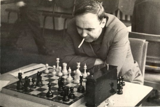 David Bronstein and Mikhail Tal. Riga, 1968. 6th Soviet Team Cup. 1-0. Photographer unknown.