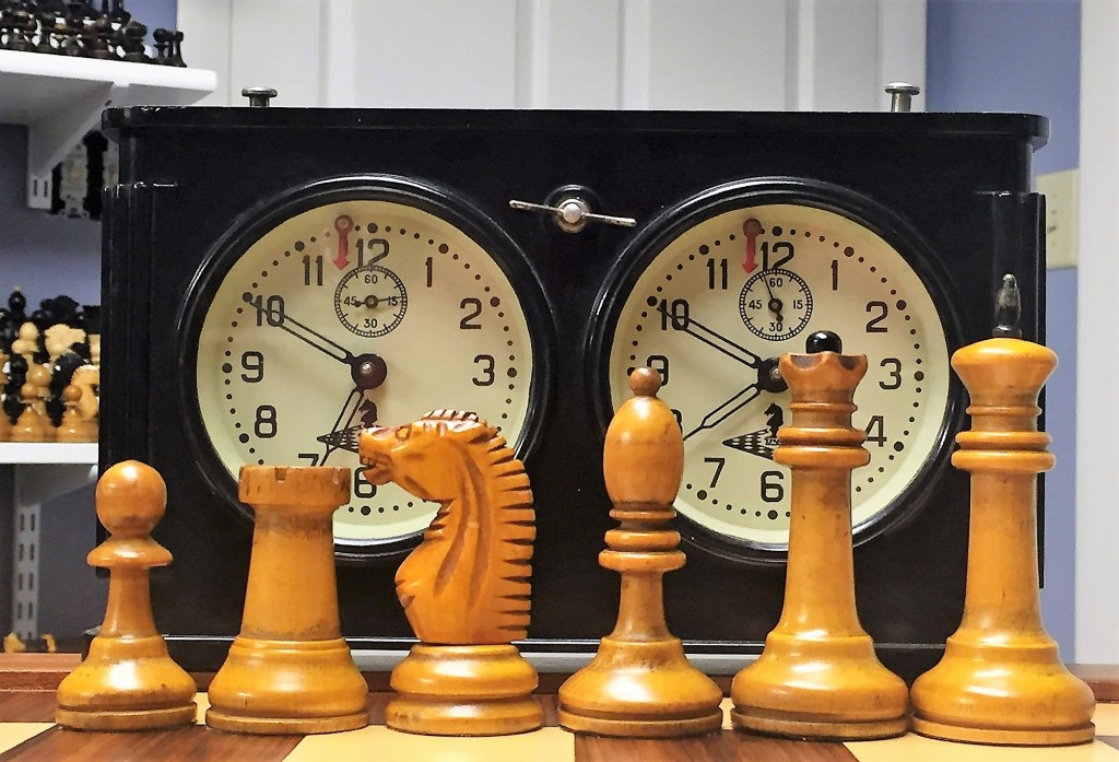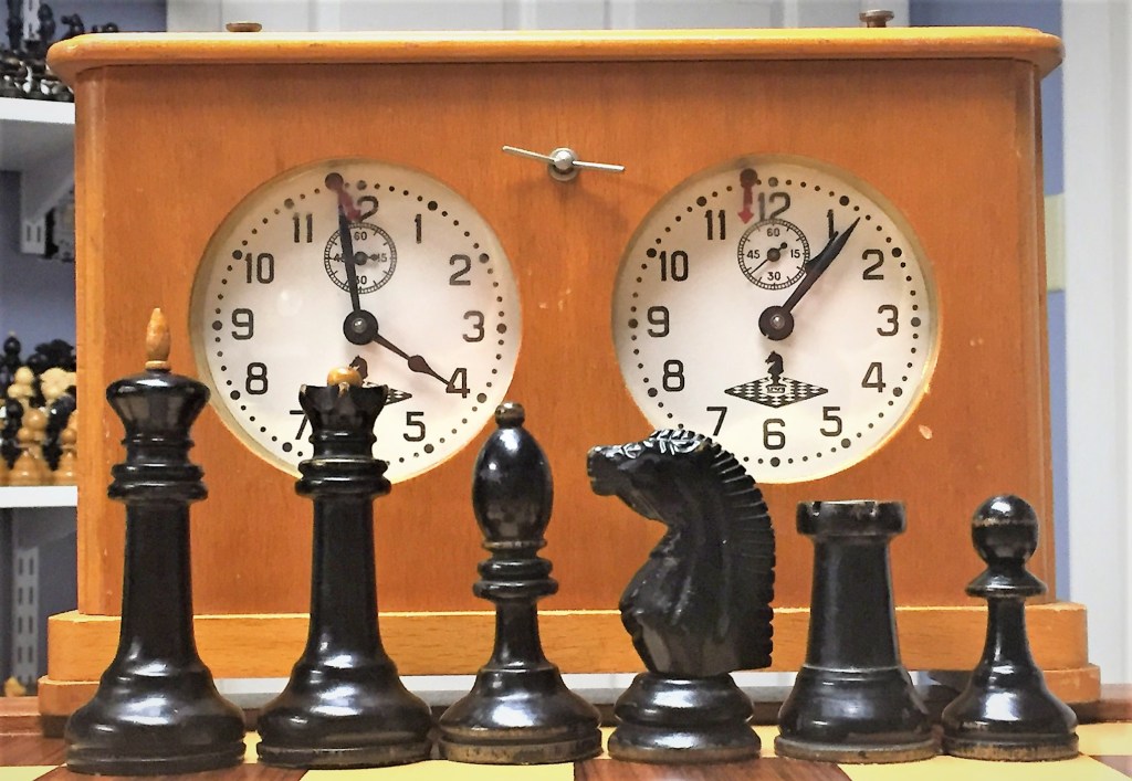 This beautiful set is named and dated by Kyiv collector and dealer Nikolay Filatov. The 110 mm kings, heavy weighting, and superior craftsmanship all mark this as a set used at the very highest levels of Soviet chess and thereby worthy of the Grandmaster name, even though I have not been able to find it in the photographic record. The lead weighting is similar to that of other tournament sets of the 1930s, a practice that ended with the outbreak of war as metal was allocated to military production. And the knight is carved in detail not found in wartime or post-war knights.