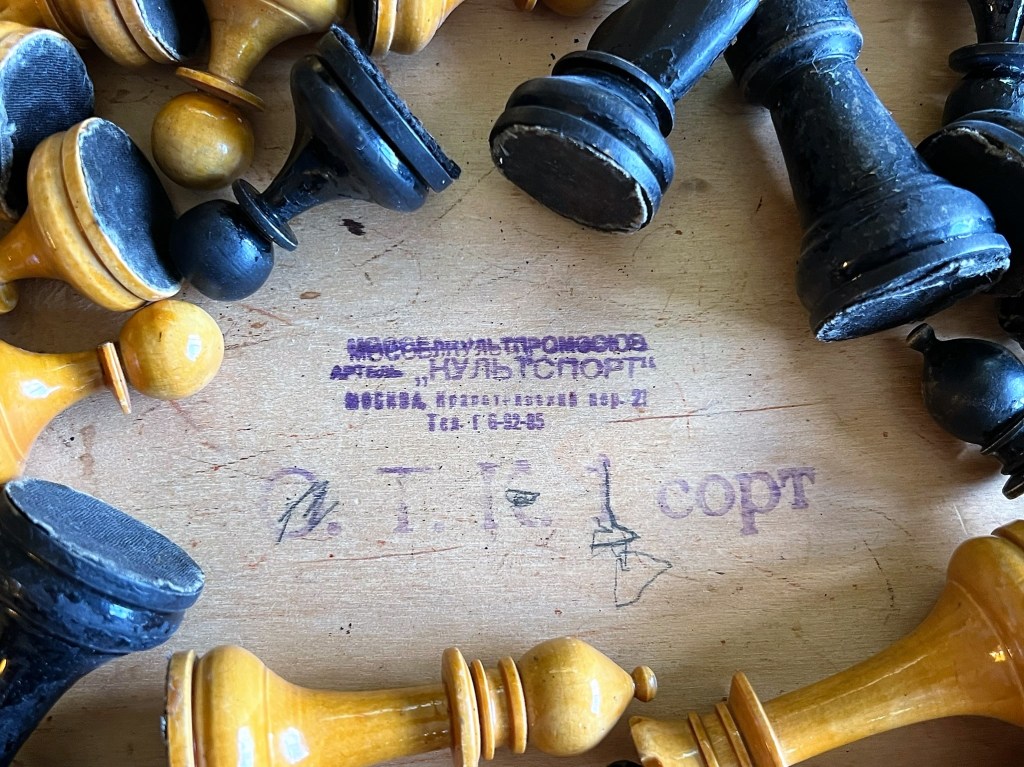 Moscow collector Alexander Chelnokov believes this line of sets was produced by the Red Combine, located near Zvenigorod, roughly 65 km west of Moscow, whereas Artel Kultsport was located in central Moscow. Chelnokov administers a Facebook group titled Russian Chess Sets (Tsarist, Soviet, and Modern) that features his magnificent collection of Tsarist and Soviet sets, and which I heartily commend to your viewing. It is ironic that this rare instance of a relative abundance of information about the production of a set provides us conflicting data, but such is the enigma of Soviet chess sets.