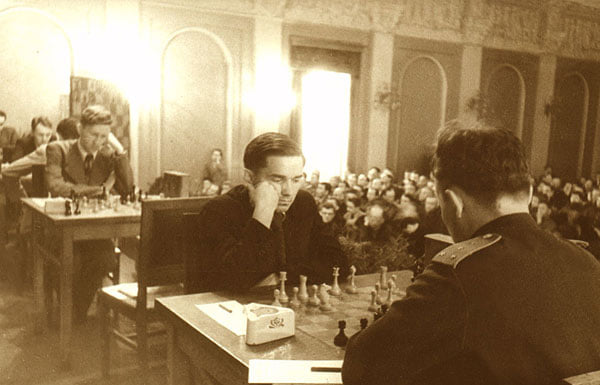 The 13th USSR Championship was held in Moscow in May and June 1944 by which time tide of the Great Patriotic War had turned against the Nazi invaders. Mikhail Botvinnik won the tournament over a field of seventeen players. It was the first Championship played since 1941. Breaking from the practice of using Botvinnik-Flohr II pieces, which were heavily influenced by Modernist design concepts, the 1944 Championship pieces were much more traditionally Staunton in their design, an evolution of the Barrel Rook set we previously have examined.