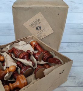 I know of two other specimens that are associated with original labels for “Chess Figure” rather than “Chess Boards.” They are shown below. The set on the left at the time of this writing is being offered for sale by SovietchessUSSRGifts on Etsy. The set in the middle photo is from the collection of Eduardo Bauza. Its label is shown on the right. The labels establish that both sets originated from the Bolekhavsky Timber Plant.