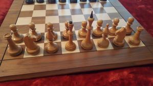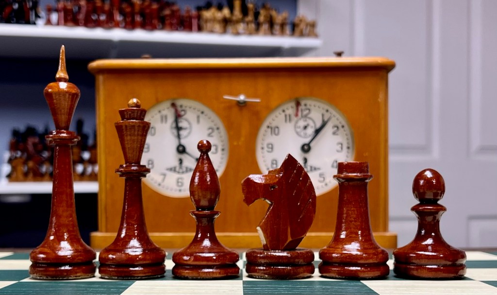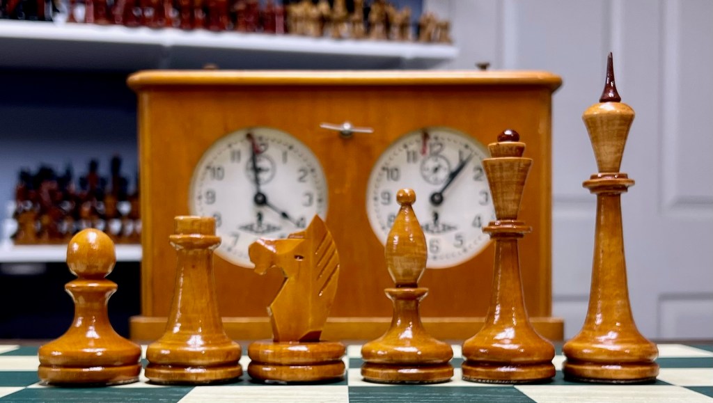 Here is a specimen I recently acquired from Kyiv dealer and collector Nikolay Filatov of SovietChessUSSRGifts. The varnished natural and burnt sienna pieces arrived in excellent condition.