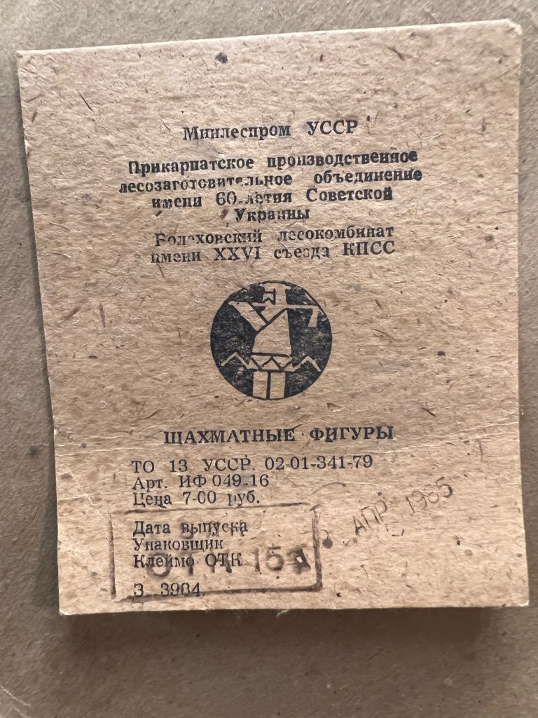 According to a translation provided by the Nikolay Filatov, the box contains Шахматные Фигуры (“Chess Figures”), which were manufactured in 1985 by the Bolekhavsky Timber Plant, Carpathian Industrial Timber Association, Ministry of Forestry, Ukrainian SSR.