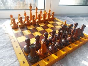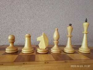 This is the chess of my childhood, proclaims Ukrainian collector and dealer Mykhailo Kovalenko. It is “the most common Ukrainian chess set… made of wood,” and was used in regional but not high level tournaments. SK 4 June 2020 & 14 April 2021, accessed 19 April 2023.
