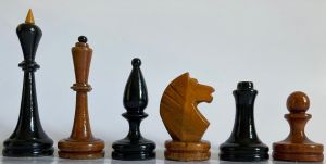 Like the royals’ crowns, the bishops’ miters also are proportionately oversized. The knights are simply cut. “The rooks are very odd,” according to collector John Moyes, “Like chimneys!” SK 19 May 2020, accessed 17 April 2023. They feature slender, tapered towers, with relatively small, ringed turrets. The pawns are immense, typically Soviet homage to the Dictatorship of the Proletariat. The pieces are unweighted. Because of the large bases, this is not a problem for any pieces other than the royals, whose great height to base width leaves them too easily toppled. Perhaps there is a metaphor lurking there as well.