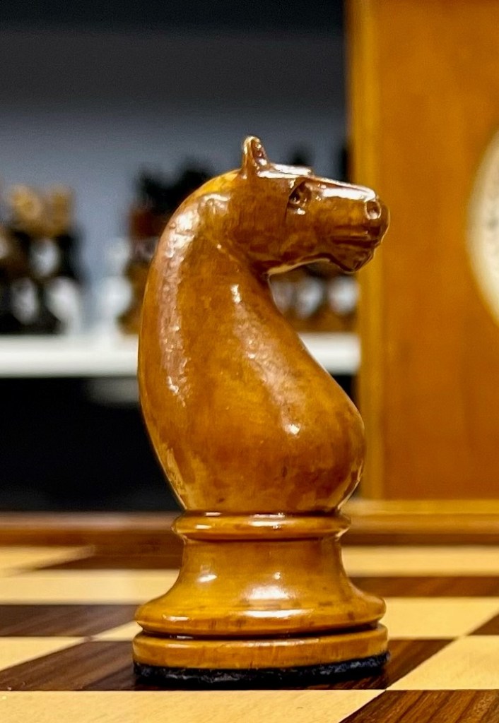 The Capablanca’s knight is turned slightly to the left of the line of the file, allowing us to glimpse both of the horse’s ears. The most evident distinguishing feature of the Capablanca Knight is the ear placement rising vertically from the arc of the back. It also has protruding eye sockets, forward-facing eyes, and a relatively short snout. St. Petersburg collector and artisan Sergey Kovalenko has described its face as a “bear.” Here is an example from my collection.