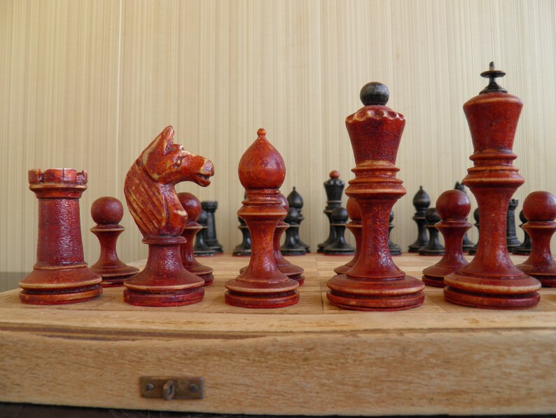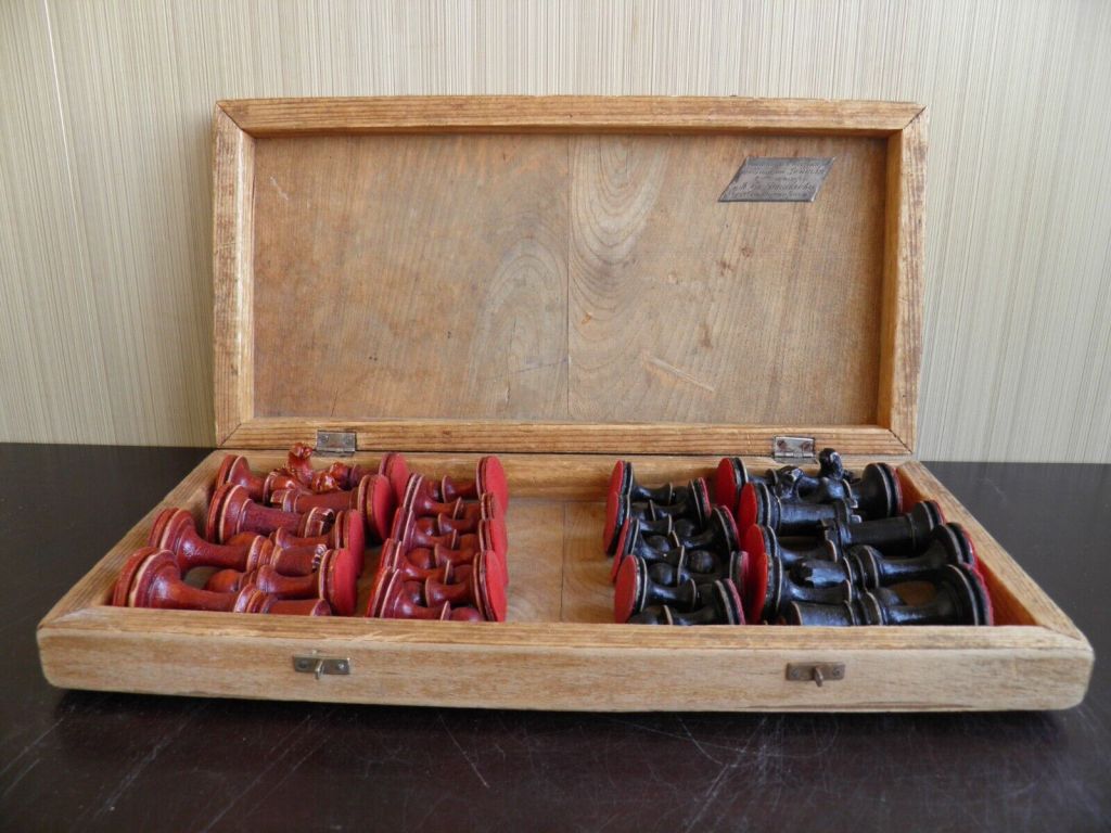 Perhaps our favorite way to date Soviet chess sets is to find them in photos that can be reliably dated, a methodology that gives us a “no later than” date to the pictured set. Sometimes, however, sets come with information on accompanying boxes that allows us to reasonably estimate their age. So it is with a fascinating set that was offered for sale by Ukrainian vendor Igor Grechyshki on EBay and Etsy. (It was sold shortly after I posted this article.) The set gives us a rare glimpse of pieces of the 1920s, a period for which there is a relatively sparse photographic record.