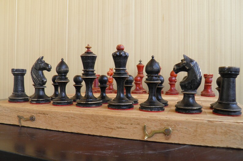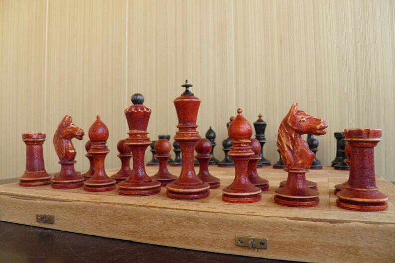 The set comprises 32 weighted wooden pieces in red and black armies, with kings 95mm tall. The pieces are housed in a typical Soviet board/box, which bears an engraved plaque.
