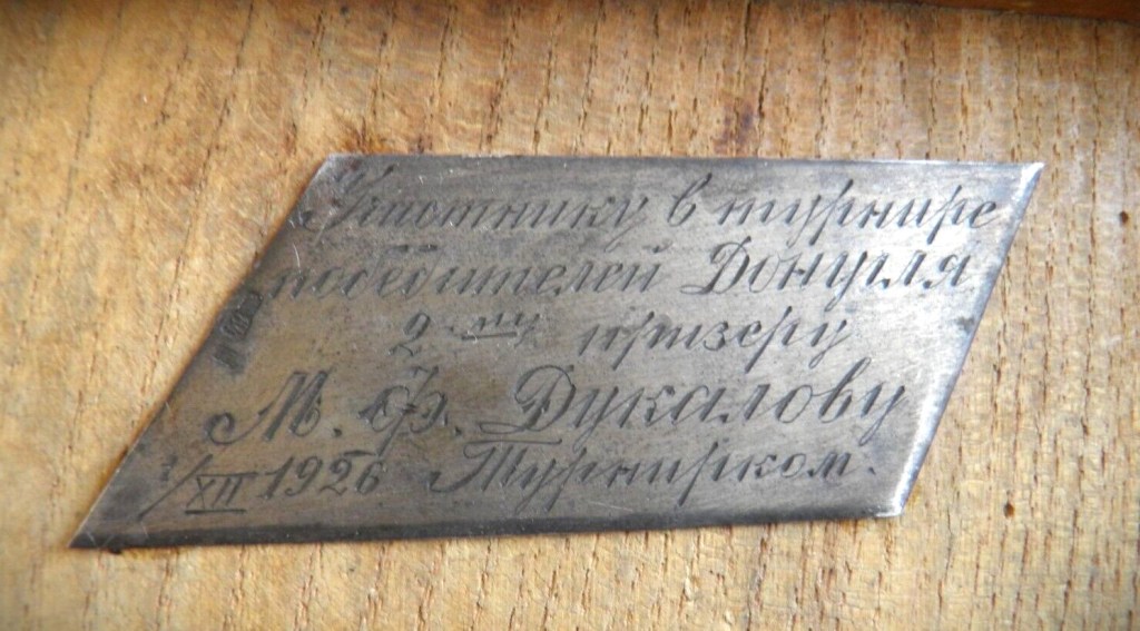 As translated by Igor, the plaque reads as follows: To the participant in the tournament of winners the second prize-winner M.F. Dukalov 1.12.26. Tournament Committee. The maker of the set is unknown, and the style is as yet unnamed. I’ll refer to it as Dukalov’s Set, in homage to the player who took second place in the tournament. Its significance lies in that it’s one of only a handful of Soviet sets we can reasonably date to the 1920s.