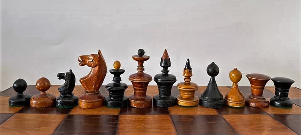 Soviet pieces characteristic of many Clubs, competitions and even simple chess lovers that in a park, or Garden, anywhere in the former Soviet Union used to use them. Almost always these pieces were made with the respective folding board that also served as a box where they were kept (such “anemic” trays of 4.5 – 5cm square for pieces with a King base with 3.5-4 cm!… All of these pieces are very reasonable in size, with the KINGS walking 10-11 cm high… [T]hey are very different sets from each other and have been used in different times… .
