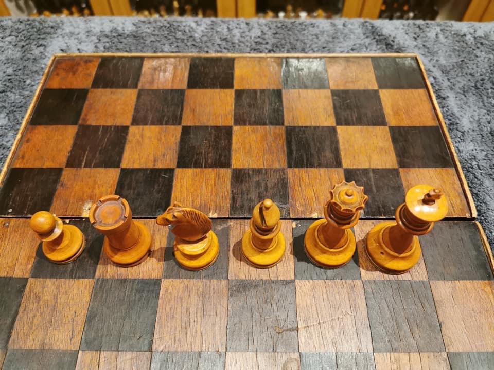 The set is tall and heavy, finely turned, carved, and finished . The pieces have a large height to base width ratio, but their weight keeps them stable in play. The king is five inches tall with a bulging crown characteristic of Tsarist sets and reminiscent of Austrian onion top sets. The queen’s coronet eschews sharp points, protecting it from damage during the rigors of play. The bishop’s miter is unique, the cut splitting it into two equal halves. The knight’s mane flows with detail, and its features are carefully carved. The rook’s turret is exaggerated, its merlons tall and distinctly cut.