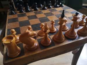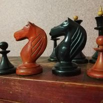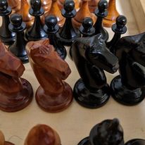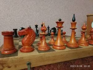 The design is both very simple and surprisingly elegant. Simplicity of design made sense for a set that was to be produced by unskilled or semi-skilled child Gulag labor. The bases and stems of the royals, clerics, and pawns form a cone, providing the pieces a good degree of balance. The “step-up” base characterizing the base-to-stem transition of the traditional Staunton design has been simplified to a circular cut. The stem ends at a disc-shaped pedestal, but the double collars characteristic of Staunton clerics and royals have been eliminated. The royals’ crowns are simply turned, the Staunton cross replaced by a tear-shaped turned finial on the king’s crown, and pointed crenels replaced by simple cuts on the queen’s coronet. The elaborately carved Elgin Marble knight has been replaced by a simply carved horse of a pleasing shape but little detail. The kings are 90 mm. The pieces are weighted with plaster. The set is made of birch, and the black pieces are simply painted. The design was successful and was produced all the way to the end of the Soviet Union, albeit in different production facilities over time. Later versions were unweighted.