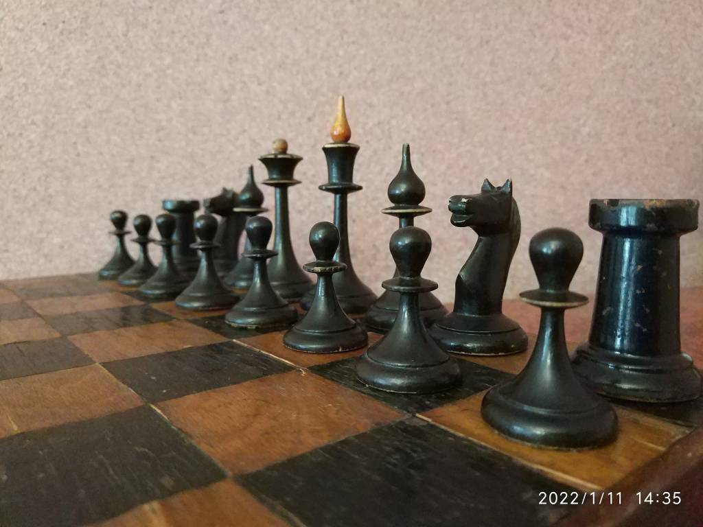 The first matter of note is that the crown of the white king on e1 appears to bear a cross. This, together with the set’s many other Staunton elements suggests a pre-Soviet origin of either the set or its design. Second, the bishop on c8 definitely is topped by a small, spherical finial. Neither this bishop nor the one on d6 appears to have miter cuts. Third, the tower walls of the rook on a1 appear to be straight. It also appears to me that this rook’s turret has four merlons.
