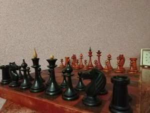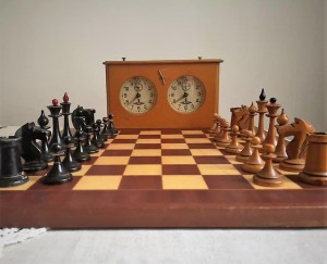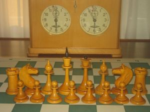 This set resides in the Russian Chess Federation’s Moscow Chess Museum. Alluding to the famous 1925 film starring Jose Raul Capablanca, it describes the set as “A typical tournament set of Soviet Chess of the times of the ‘Chess Fever’ of the second half of the 1920s – the beginning of the 1930s.” It asserts that sets like this were used in the 1933 Botvinnik-Flohr match. Alas, the set is a reproduction manufactured by the Indian firm ChessBazaar, not an original. Here is the reproduction: