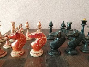 Despite their popularity and longevity, I have hesitated to write about the ubiquitous Valdai Nobles chessmen. It’s not that I don’t like them–I have four specimens in my collection, each with unique attributes. I am fascinated by their design and evolution, particularly the faceted knights characteristic of the mature versions. Nothing has stopped my friends Alan Power and Eva Silvertant from authoring informative articles about them.