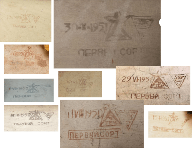 Following Stalin’s death and Beria’s general amnesty of 1953 , the star Gulag trademark disappeared on many of the Mordovian sets, and stamps bearing the Tempromkombinat name begin appearing. Tempromkombinat is a Soviet acronym for the Temnikovsky Industrial Combine of Gulag. Here are some examples.